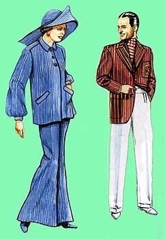 Мужчины той поры, следившие за модой, надевали для выходов и прогулок красиво сшитые, широкие в плечах, элегантные полосатые пиджаки различных цветов. Эти пиджаки обычно были однобортные (как показано на рисунке), но встречались и двубортные модели. Брюки ("фланели", как их называли) облегали талию и могли быть белыми, синими, серыми или зелеными. В то время становилось модным нововведение - застежка-молния для брюк. Такой прогулочный костюм всегда дополнял полосатый или цветной шейный платок.
